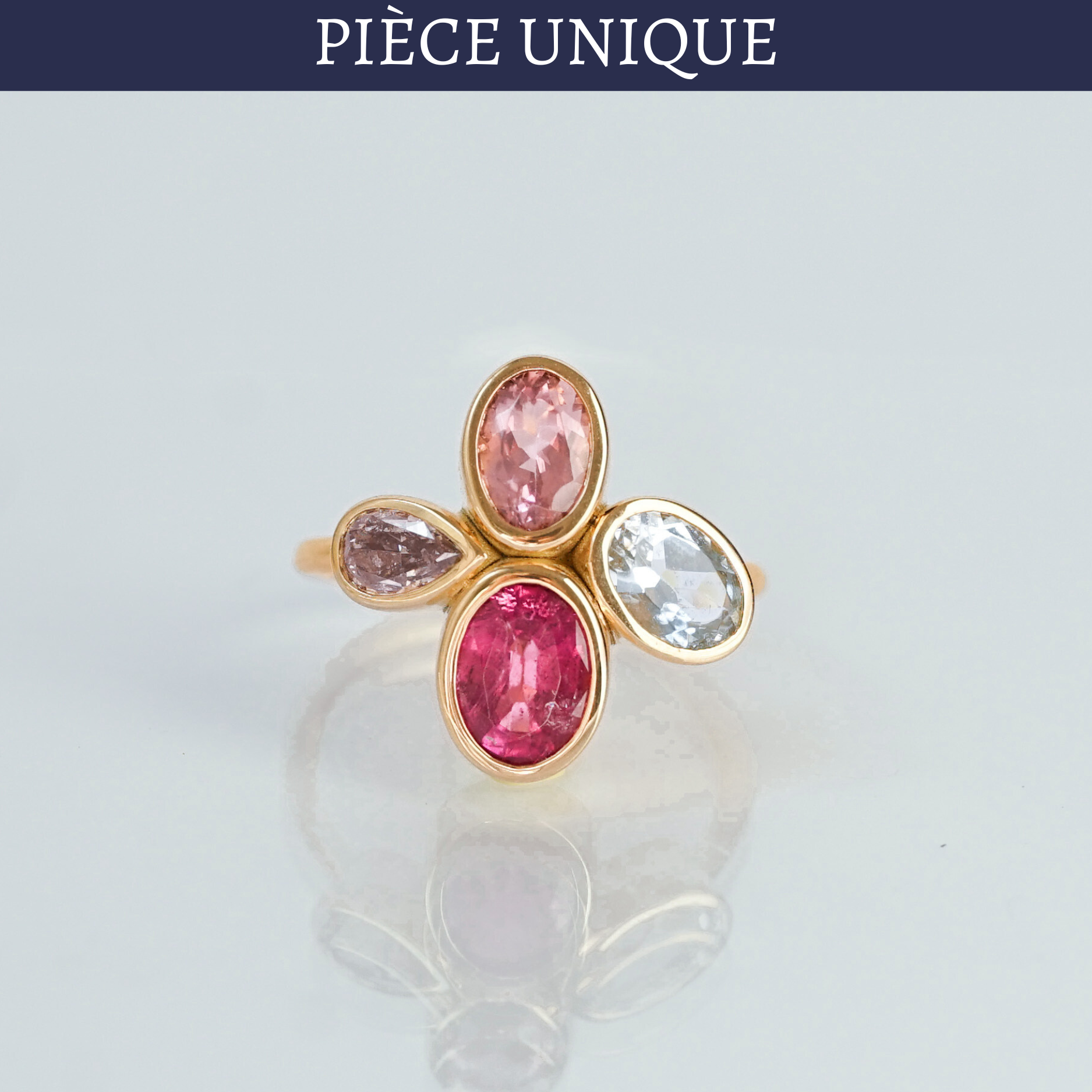 Bague en or recyclé 18 carats (750 millièmes), tourmaline rose fuchsia taille ovale, tourmaline rose pâle taille ovale, tourmaline translucide taille ovale, diamant brun taille poire.