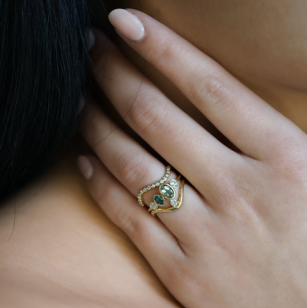 Rondeur et sertis clos sont les maîtres-mots de ce duo. Notre Bague Vague Lorène au rendu graphique, sertie de diamants blancs, est une ode à la mer. L'alliance en or recyclé 18 carats se marie parfaitement avec le bleu des tourmalines de notre Bague Brillant Anna.