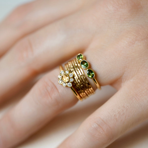 De la couleur pour faire chavirer les cœurs. Mettons le traditionnel de côté et osons les demandes colorées. Citrine jaune et diamants blancs taille brillant pour notre Bague marguerite Valentine, comme une invitation du soleil à la main. Optez pour des coloris plus assumés avec notre Bague Trio Vert Valentine, en or recyclé 18 carats et ses tourmalines.
