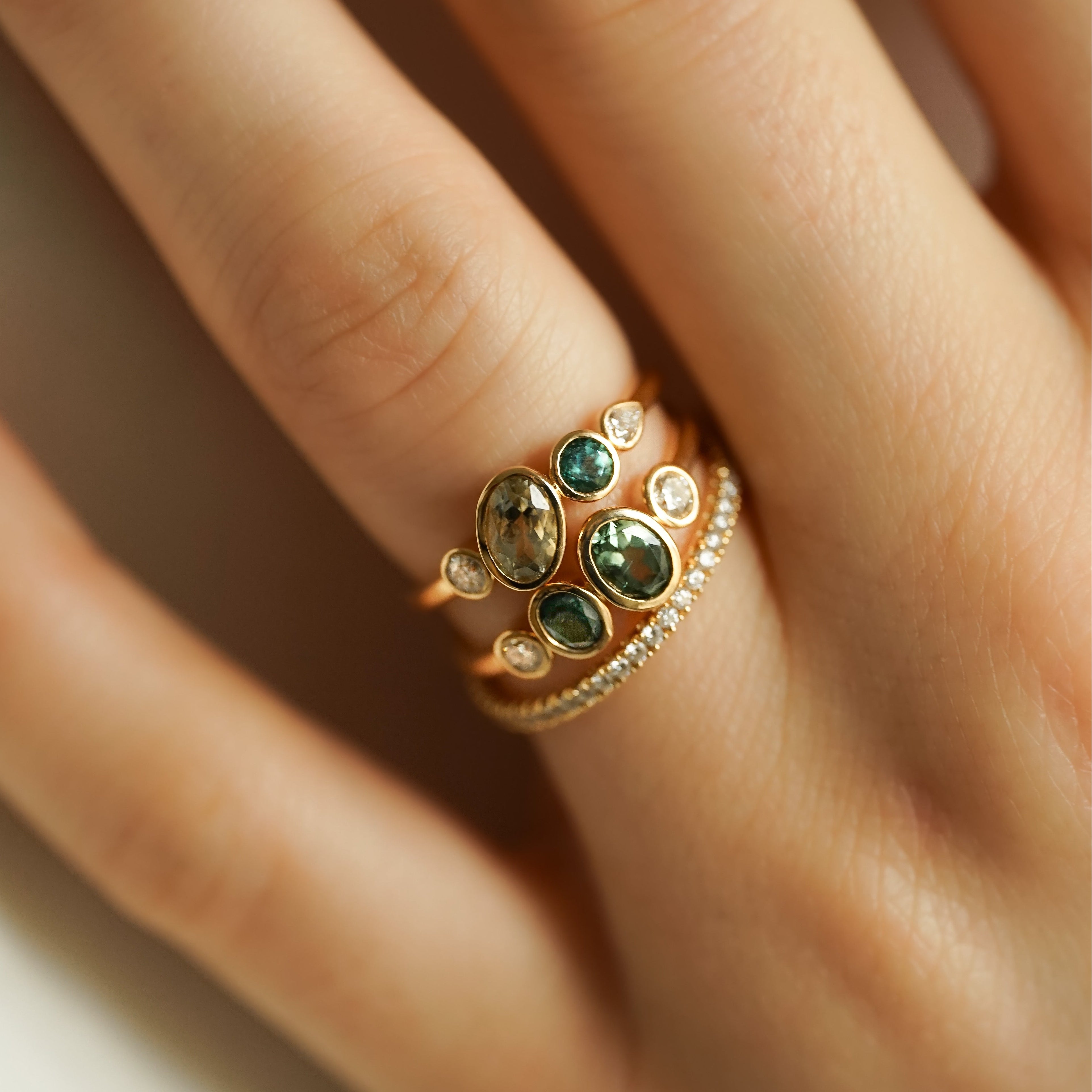 Bague en or recyclé 18 carats (750 millièmes), diamants blancs, tourmalines vert d'eau.